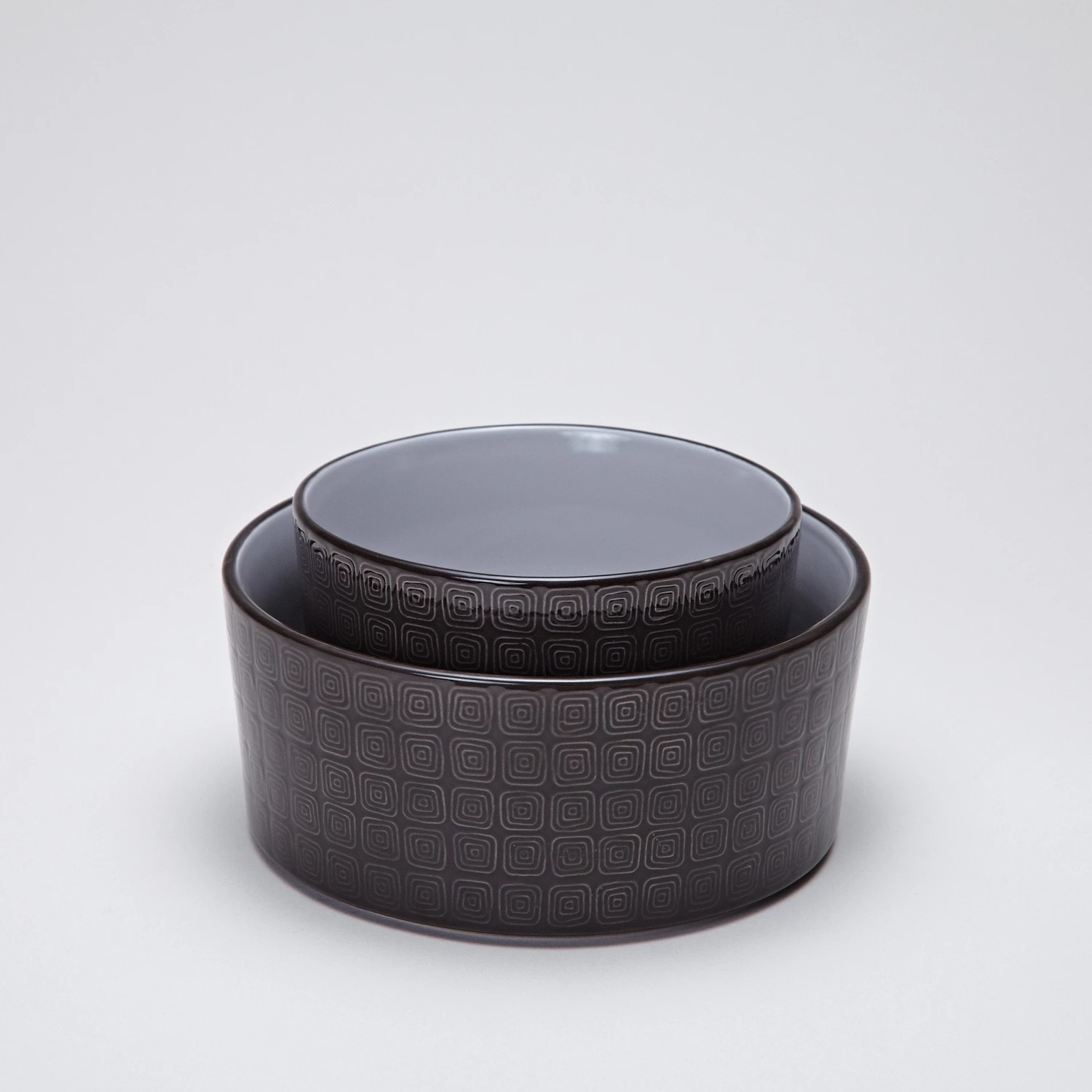 Ce bol rompt discrètement son design minimaliste avec un motif graphique gravé en surface. De couleur mocca à l’extérieur, il est gris bleuté à l’intérieur.