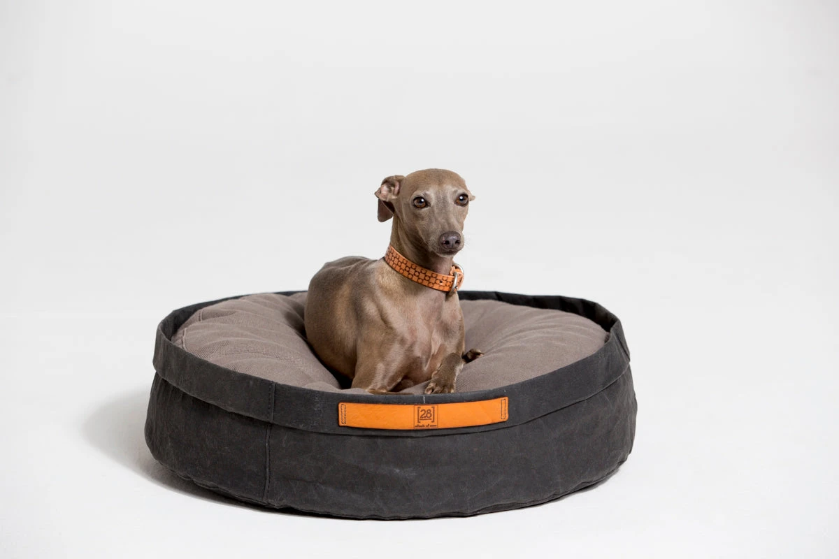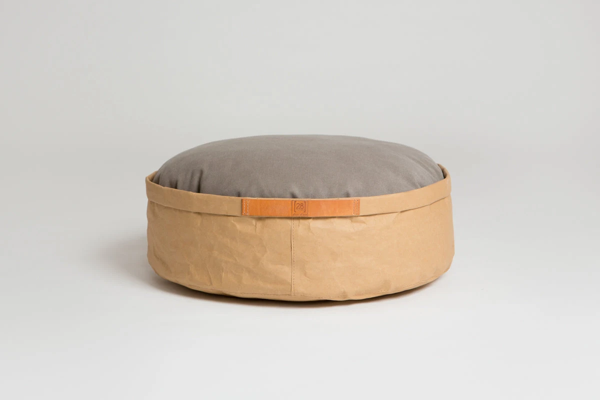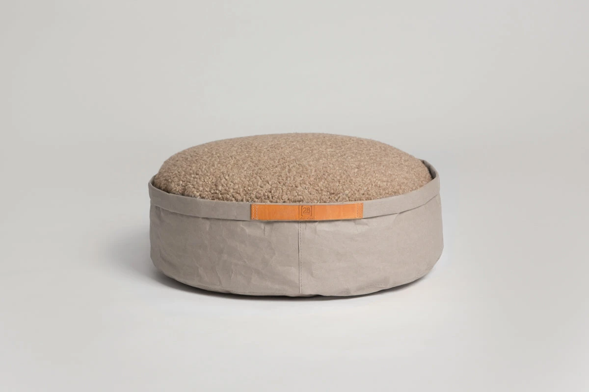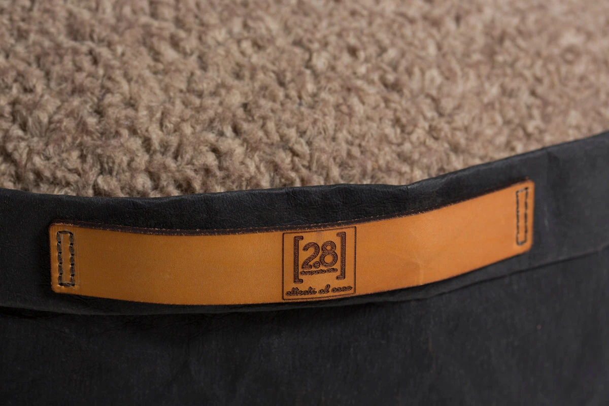 Le coussin pour chats et chiens Irvin est présenté dans une belle corbeille en cellulose qui le rend unique et lui donne cet aspect « papier » si caractéristique et original. Ses poignées sont en cuir camel. Le modèle est disponible en 3 coloris : cigare havane, noir et gris clair.