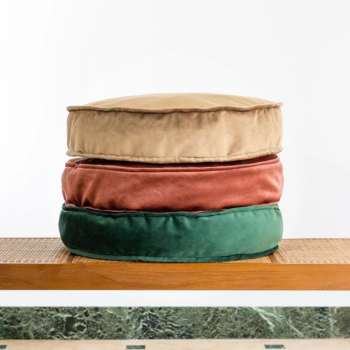 Ce coussin rond est ainsi proposé dans un beau velours, disponible en rose, beige, bleu clair, bleu pétrole et vert impérial.