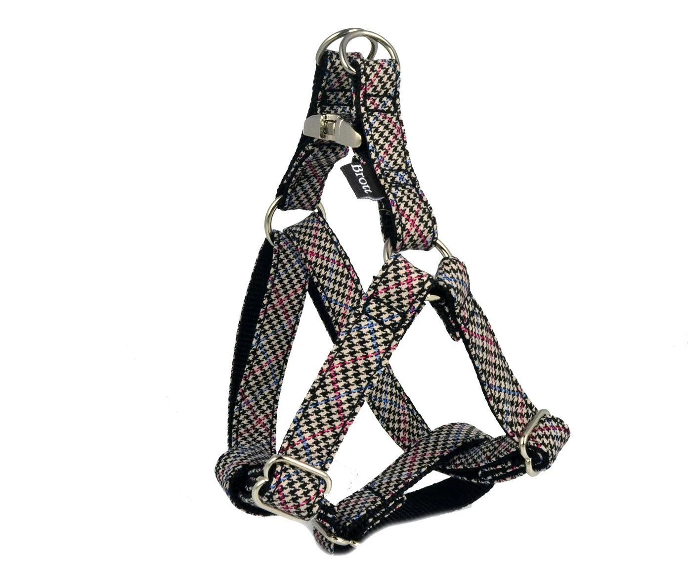 Le harnais Biosca a un imprimé pied-de-poule mélangé à plusieurs couleurs. Bien que l’original a des couleurs de base comme le blanc et le noir, Brott a créée ce fond beige avec des rayures bleues et roses. Chic et original, un vrai classique.