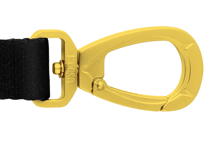 GOLD CAVIAR, un noir total qui n’est pas banal. Mousqueton et petites pièces en métal doré pour rehausser le ruban de satin noir. Une ligne urbaine kitsch .