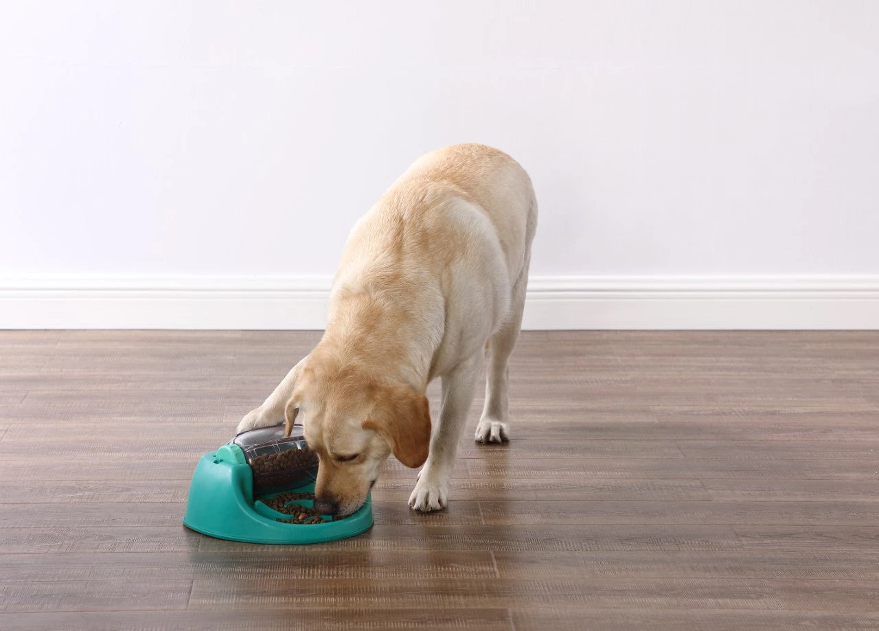 Spin N’ Eat est un jeu d’intelligence proposĂ© sous la forme d’un puzzle pour chien qui s’utilise aussi comme une gamelle anti-glouton.