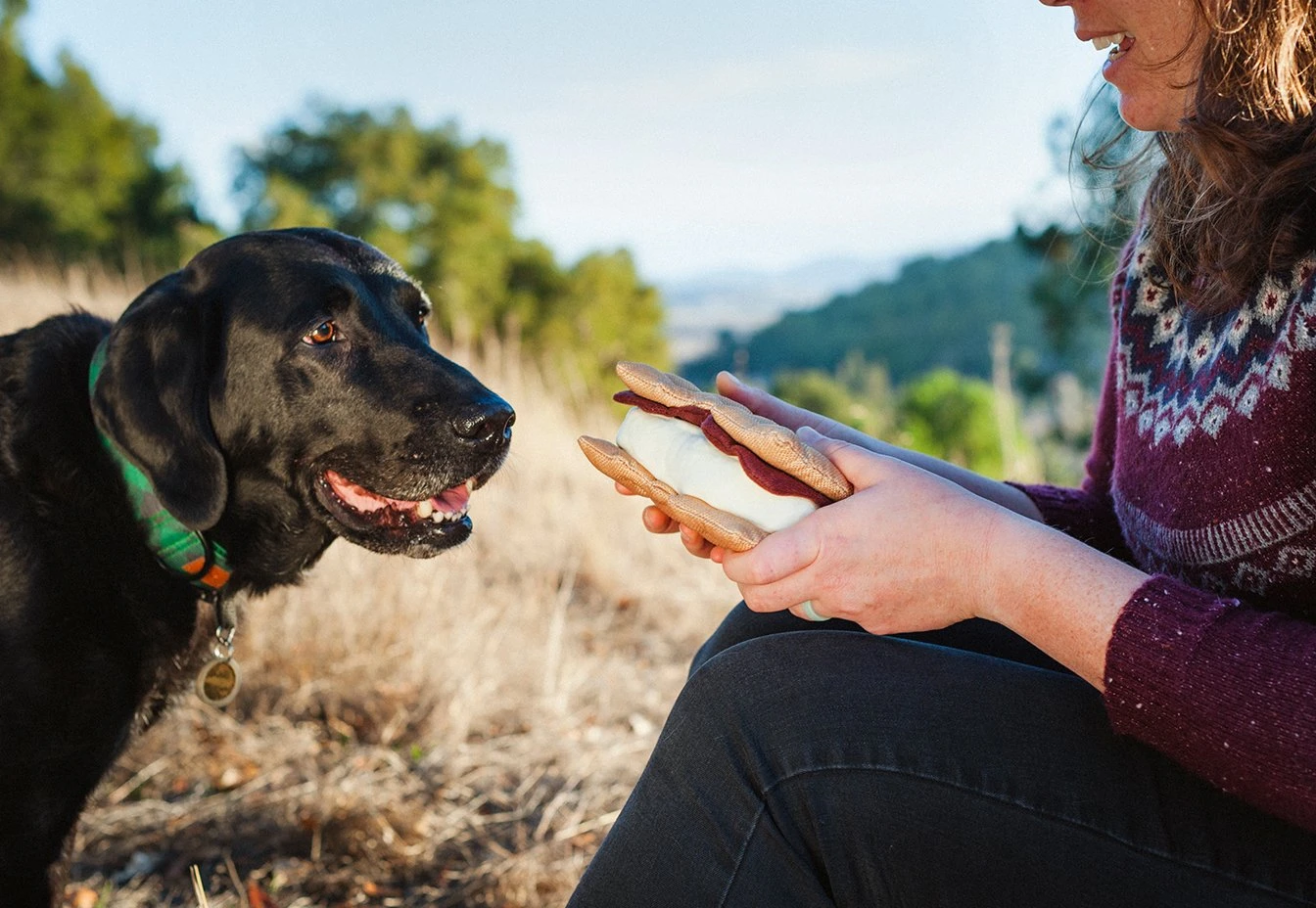 Jouet pour chien en forme de Sandwich gimme s’mores. avec garniture fouettĂ©e, des pĂ©pites de chocolat et les guimauves Ă faire griller au coin du feu.